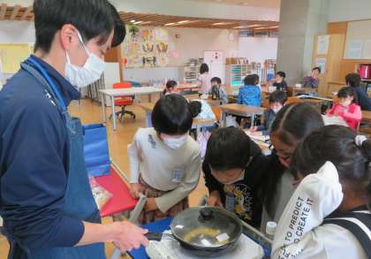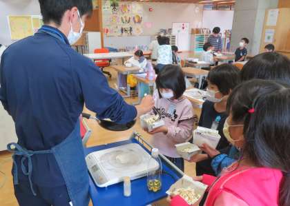 今日は、自分たちで育ててきたポップコーンを食べました。フライパンで熱したときの匂いや、小さな種が跳ねて、白いポップコーンに変わる様子に、とても驚いていた子供たち。最後まで、美味しく食べることができました。