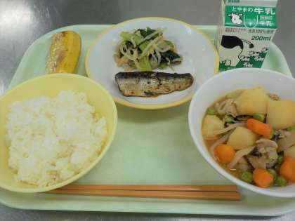 今日の献立は、ごはん、牛乳、いわしの土佐煮、もやしのおひたし、豚肉の南蛮煮、バナナ です。