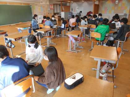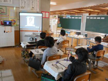 4年生の習字は動画で(中)、5年生の学活は端末で(右)で行っていました。時代です。