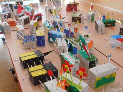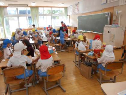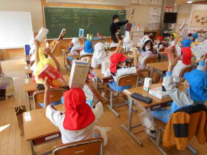 1年生の算数は、廃材を利用して色々なものをつくります。一見、ただのおもちゃつくりのようですが、角・円といった算数の特性を学びます。