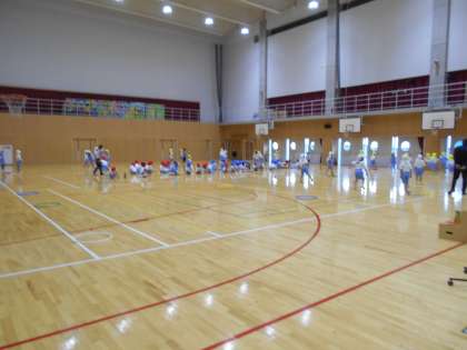 1年生の体育ではチーム対抗戦で楽しんでいました(右)。