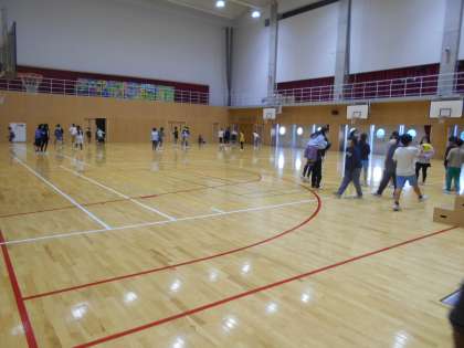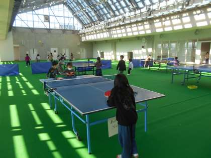 屋上へ上がると1年生がルールも知りませんが卓球を楽しんでいます。体育館では5年生が遊んでいます。