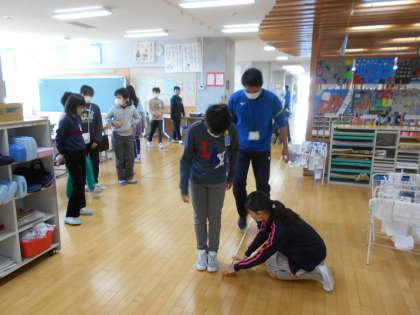写真は、2年生の体育でサッカー(中)と、5年生の算数です(右)。きっとこれで自分の歩幅を知っていれば大体の長さが分かるという学習かな?