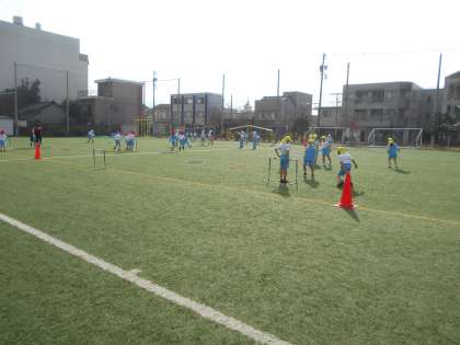 写真は、2年生の体育でサッカー(中)と、5年生の算数です(右)。きっとこれで自分の歩幅を知っていれば大体の長さが分かるという学習かな?