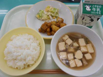本日の献立は、魚と豆のカレー揚げ、れんこんサラダ、豆腐のスープ、です。