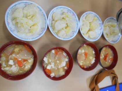 班ごとにみそ汁の具を考え、オリジナルのみそ汁を作りました。野菜たっぷりのみそ汁や、なめこや麺が入ったみそ汁など、いろいろなアイデアのみそ汁が完成しました。また、セントラル水田から収穫したお米も鍋で炊いて食べました。感謝の気持ちをもち美味しくいただくことができました。班の友達と協力し分担して作業することができていました。