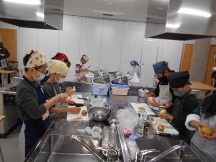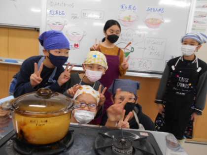 班ごとにみそ汁の具を考え、オリジナルのみそ汁を作りました。野菜たっぷりのみそ汁や、なめこや麺が入ったみそ汁など、いろいろなアイデアのみそ汁が完成しました。また、セントラル水田から収穫したお米も鍋で炊いて食べました。感謝の気持ちをもち美味しくいただくことができました。班の友達と協力し分担して作業することができていました。