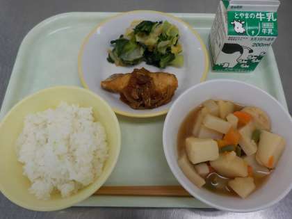 今日の献立は、ごはん、牛乳、魚の黒酢あん、はくさいひたし、関東だき です。