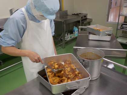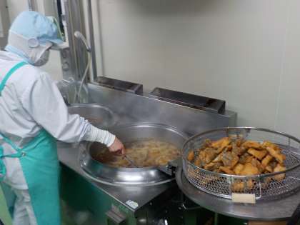 「魚の黒酢あん」はホキの切り身を揚げ(写真中)、黒酢や玉ねぎなどで作った“あんかけ”をかけています(写真下)。黒酢の香りでさっぱりと食べられます。