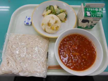 本日の献立は、ミートソース(ソフト麺)、蒸しパン、白菜とりんごのサラダ、ポケットチーズ、です。