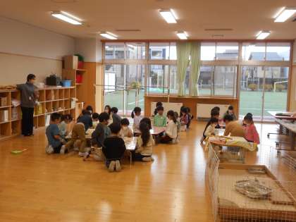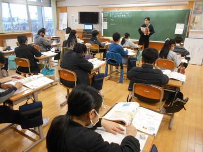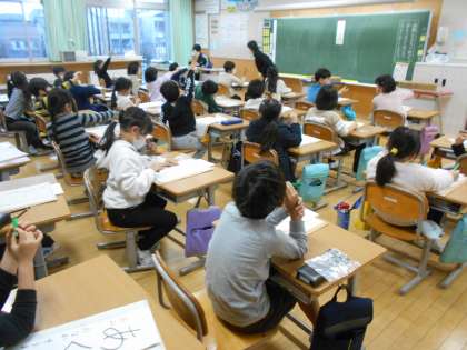 また2年生では書き初め大会の練習をしていました(中)。今年は、子供同士の相互評価によるプレ大会も年内にやる予定です。