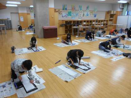 4年生が書き初めの練習(中)、6年生が音楽に挑戦(右)していました。
