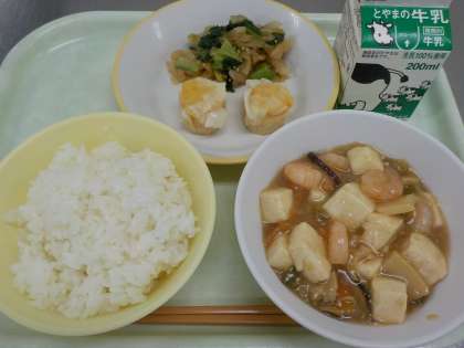 今日の献立は、ごはん、牛乳、にんじんシューマイ、大根ナムル、えびと豆腐のうま煮 です。