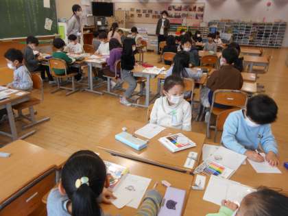 HPでも紹介しているように2年生が生活科で交流会(左)を行っていました。1年生は国語でお店屋さんごっこです(中)。「○○」というカード払いもあったりして今時です。どちらも楽しそうです。