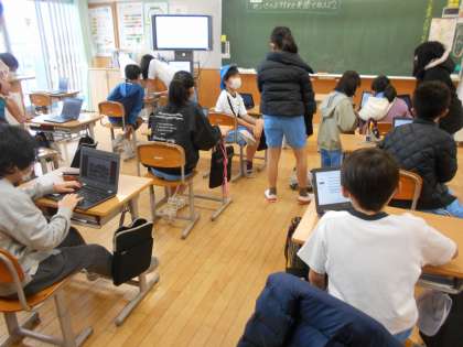 5年生が日本語を英語に翻訳をしていました(右)。端末を使うと、あっという間です。
