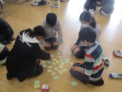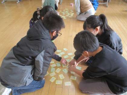 1月のかるた大会に向けて、百人一首の練習をしています。子供たちは、黄札、緑札、橙札の句を繰り返し口にしたり、友達と対戦したりして練習しています。練習では、上の句を聞いただけで札を取り、嬉しそうにする姿や、取ろうと思った札が取れなくて悔しそうにしている姿、また人気のある句が詠まれた時に大盛り上がりする姿など楽しい雰囲気に包まれました。