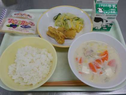 今日の献立は、ごはん、牛乳、ちくわのカレー揚げ、あわせ和え、豆乳汁、ブルーベリークレープ です。
