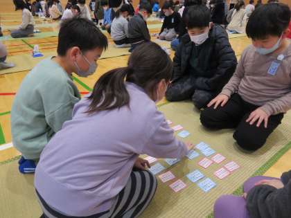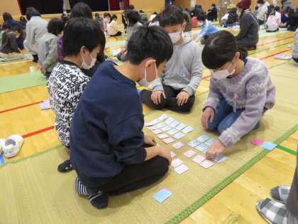 かるた大会では、桃札と青札を取り合いました。「きりぎりす〜」や「〜とやまの〜」「〜まにまに」などを勝負札にしていた子供が多く、接戦となっていました。