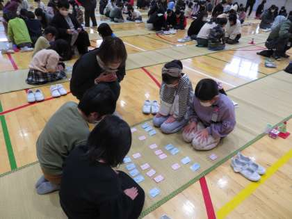 子供たちは下の句に素早く反応し、白熱して札を取り合っていました。中には、上の句を読み始めた段階で、素早く札を取る子もいました。
