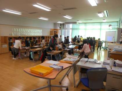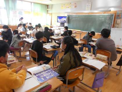 写真は、2年生の3学期の係活動(中)、5年生の理科で友達と経験を話しています(右)。