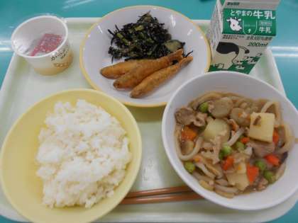 本日の献立は、わかさぎのフリッター、ひじきの胡麻和え、豚肉の南蛮煮、納豆、です。