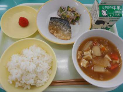 本日の献立は、さばの塩焼き、えのきの梅肉和え、のっぺい、いちご、です。