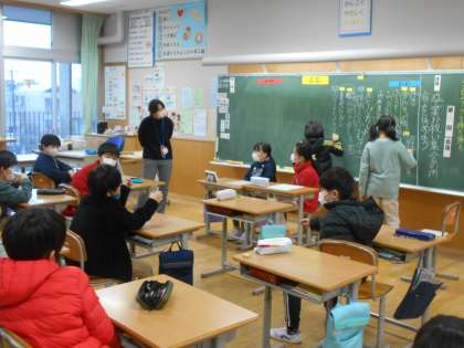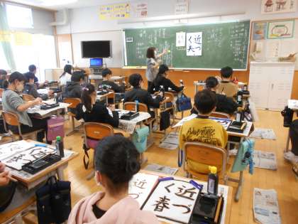 中は、4年生が「卒業を祝う会」の出し物について話し合っています。右は、5年生の習字に挑戦です。これなんかも「卒業」の掲示にふさわしいのでは?