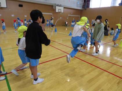 1年生 なわとび大会(長縄の部)がんばりました 公開日 2023/01/26 更新日 2023/01/26 1年生 今日は、長縄跳びの計測がありました。初めは、跳べない子供たちが多かったのですが、体育の時間や休み時間を使って自発的に練習しました。本番では、6年生にターナーをお願いし、緊張した面持ちで臨みました。どの色団も、初めに比べて回数が増え、お互いのがんばりを喜んでいました。