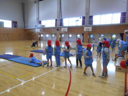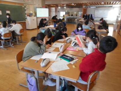 2年生の体育は、縄跳びからマット遊び(中)に変わりました。3年生は国語「ありの行列」でグループ学習です(右)。