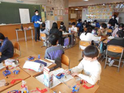 1年生は国語でクイズづくりをしていました(左)。3年生の体育は縄跳びからボール運動です(中)。5年生の理科は教材を利用しています(右)