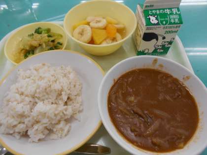 本日の献立は、ビーフストロガノフ(むぎごはん)、グリーンサラダ、フルーツミックス、ポケットチーズ、です。