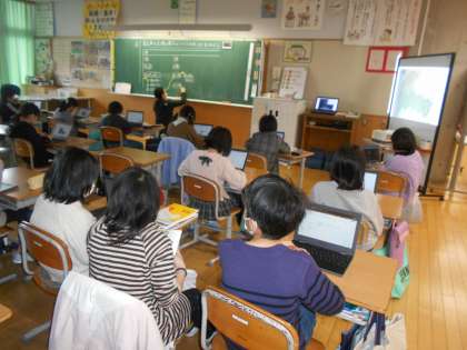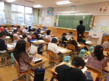 2年生の国語では名作「スーホの白い馬」です(中)。3年生は社会科で各学校を確認していました(右)。どんな学習でしょうか?