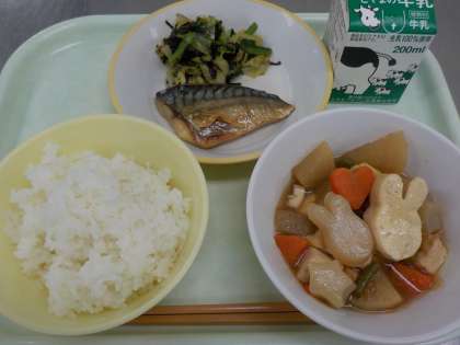 今日の献立は、ごはん、牛乳、さばの塩焼き、磯和え、大根と厚揚げの中華煮 です。