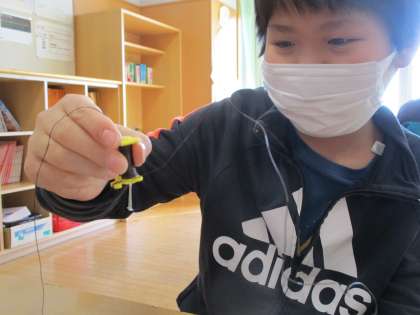 理科「電流がうみ出す力」では、電磁石の性質や電磁石の強さについて、実験キットを使いながら学習しています。子供たちは、実際に導線を巻いてコイルを作り、そのコイルに鉄芯を入れ、電流を流すことで電磁石を作りました。また、変える条件と変えない条件を意識し、どうやったら電磁石が強くなるのかを考えながら、グループで実験に取り組みました。