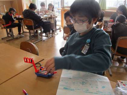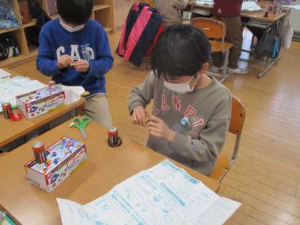 理科「電流がうみ出す力」では、電磁石の性質や電磁石の強さについて、実験キットを使いながら学習しています。子供たちは、実際に導線を巻いてコイルを作り、そのコイルに鉄芯を入れ、電流を流すことで電磁石を作りました。また、変える条件と変えない条件を意識し、どうやったら電磁石が強くなるのかを考えながら、グループで実験に取り組みました。