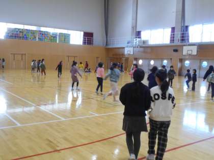 水曜日は、子供たち待望の「なかよしタイム」です。北陸には珍しく天気の良い冬の一日で、グラウンドで遊んでいました。グラウンドは2年生、体育館は3年生のようです。