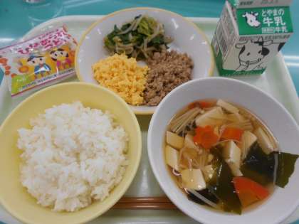 本日の献立は、そぶろ丼(豚そぼろ、炒り卵)、なばなのおひたし、すまし汁、雛あられ、です。