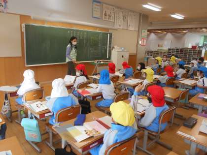 1年生が国語を学習していました(右)。