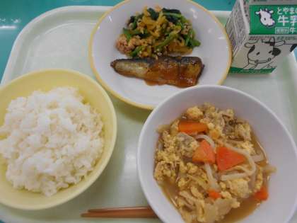 本日の献立は、いわしのおろし煮、納豆和え、卵とじ、です。