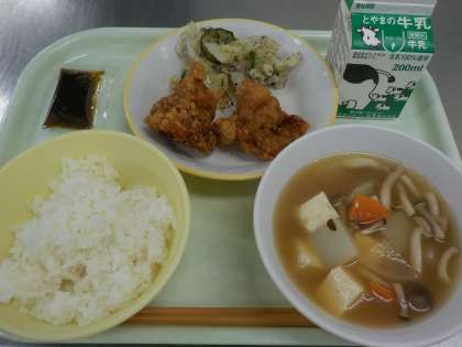 今日の献立は、ごはん、牛乳、鶏肉の竜田揚げ、ゆかり和え、けんちん汁、のり佃煮 です。