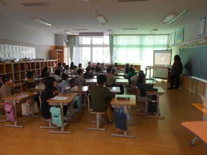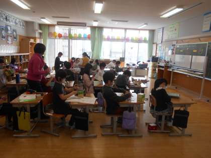 2年生がボッチャを楽しみ(中=動画でルールを確認)、4年生が算数で展開図を学習(右)していました。ボッチャをレンタルしましたが、意外に好評で忙しい中でも沢山の子供たちが触れていました。