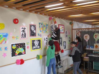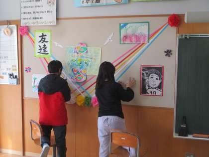 卒業生へのお祝いの気持ちや感謝の気持ちを表すために、学校内の掲示環境を整えました。子供たちは、自分の担当場所の掲示に責任をもち、みんなで協力しながら作品を掲示しました。6年生の教室や廊下などの掲示が張り替えられ、「卒業式」一色の掲示になった学校内を見て、満足感や達成感を感じている様子でした。