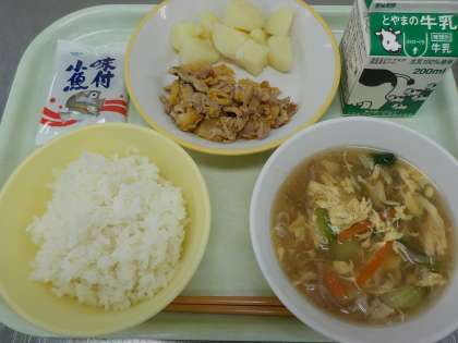 今日の献立は、ごはん、牛乳、豚肉のキムチ炒め、こふきいも、中華かきたま汁、味付け小魚 です。
