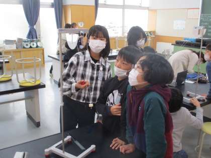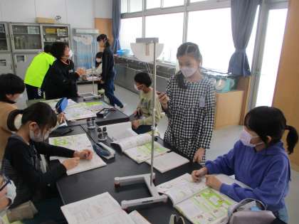 理科「ふりこのきまり」の学習では、ふりこの1往復する時間は、何によって変わるかを予想し、実験の条件を考えながら学習しています。子供たちは「ふりこの長さ」「おもりの重さ」「ふれはば」の3つに注目して実験を行い、ふりこのきまりを見つけ出していました。