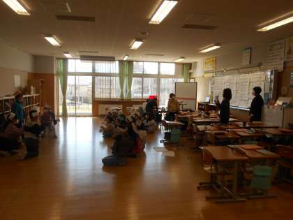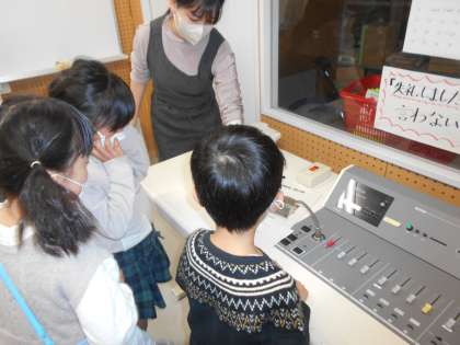 1年生が校内放送で屋上卓球台の使い方を放送し(中)、図工で「すきまちゃん」の教材をやっていました(右)。いろんな所にいる「すきまちゃん」を見付け、端末の写真で撮って紹介します。