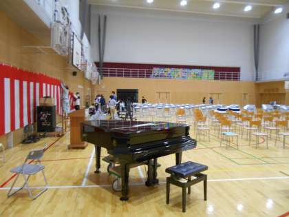 卒業式当日の17日(金)です(左)。在校生代表の5年生と教職員で環境を整え(中)ました。