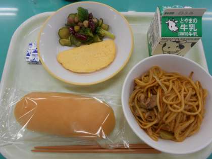 本日の献立は、焼きそば、オムレツ、ビーンズサラダ、ポケットチーズ、です。