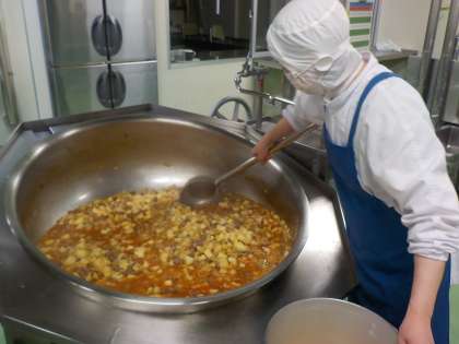 今年度最後の給食です。ごはん、牛乳、わかさぎのフリッター、こんにゃくサラダ、ボルシチ になります。写真(下)は「ボルシチ」を配缶している様子です。