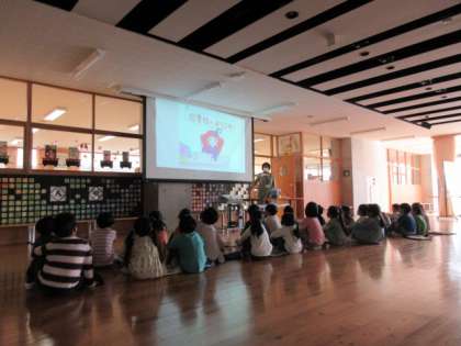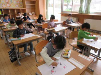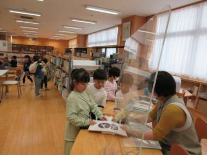 図工では、自分の好きなものや好きなことをテーマに絵を描きました。司書の先生から、図書室の使い方について話を聞きました。図書室で好きな本を選ぶ子供たちの顔はとても輝いていました。