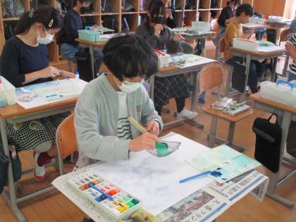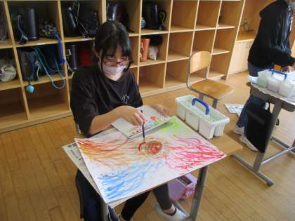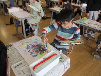 図画工作科「音のする絵」の学習では、耳をすまして聞こえてくる音や生活の中でよく聞く身近な音など、音から感じたことを形や色で表しました。子供たちは表したいことや、どのように表すのかを考え、音のイメージを膨らませながら作品を仕上げていました。